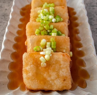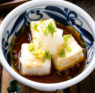 Agedashi Tofu 是一道日本传统的豆腐菜肴,将豆腐裹上薄薄的面粉,然后炸至金黄酥脆,最后浸泡在特制的酱油汤中。在京都的清水寺周围和东京的深川等地,有许多传统的日式料理店供应这道美食,口感清爽,入口鲜美,是一道极具地道风味的日本美食。