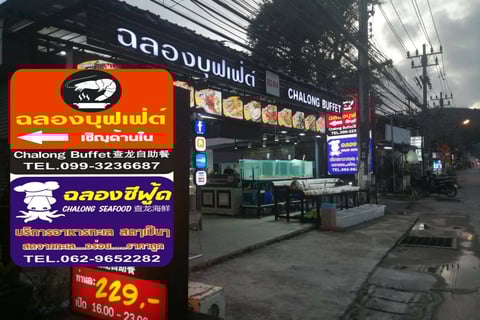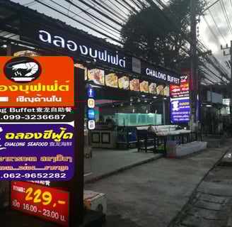 你知道普吉岛上Chalong Buffet 只需要229泰币起就可以享受丰盛的海鲜自助晚餐!白天不营业,傍晚17:00开始进客,营业时灯火通明,非常好找。